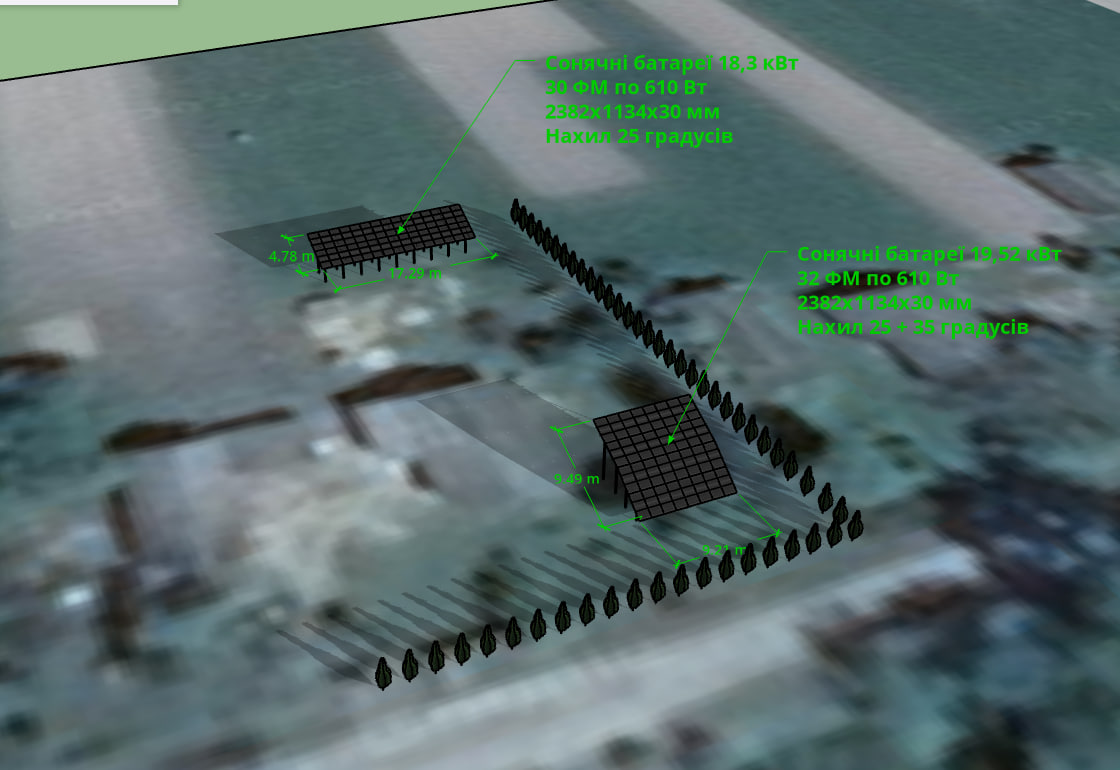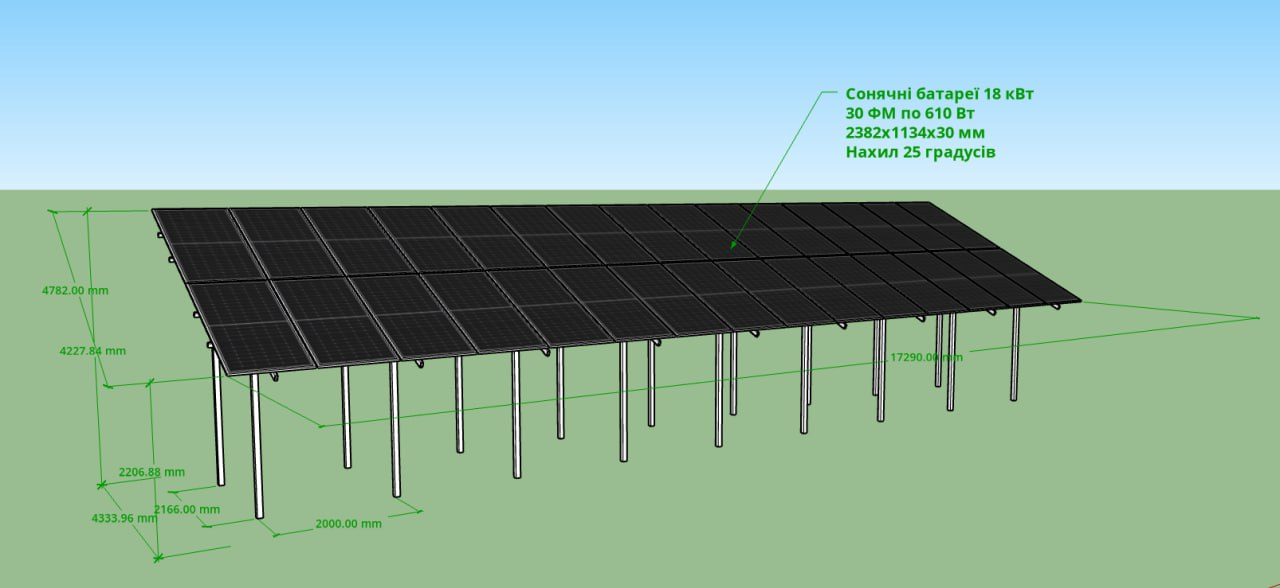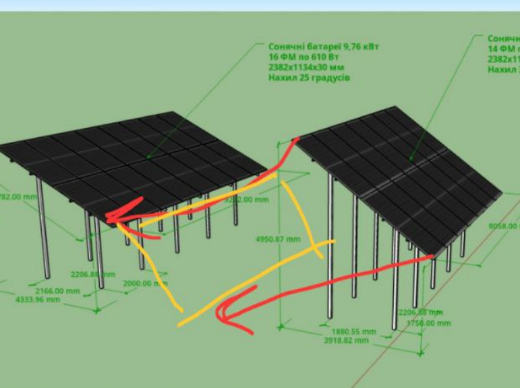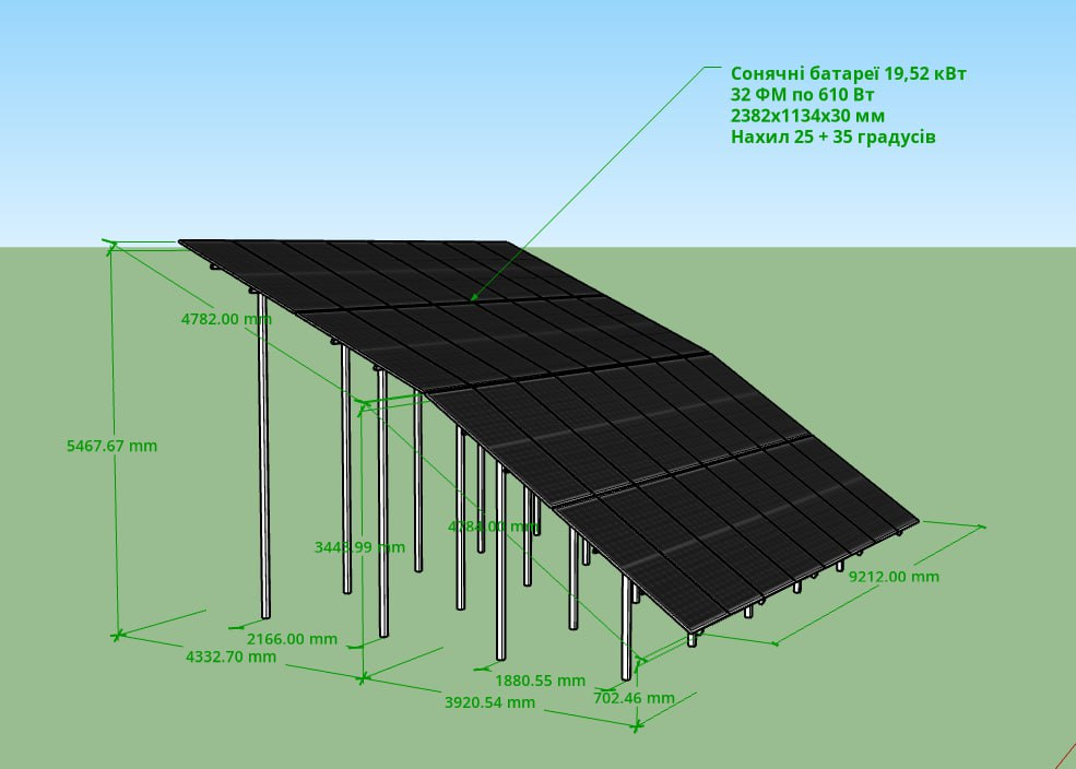 Цей етап ескізного проектування був ключовим для демонстрації переваг багатофункціонального рішення. Ми показали, як конструкція з панелями може гармонійно вписатися в простір біля дому, створюючи не лише джерело енергії, а й затишну зону для відпочинку. Це дозволило б не лише генерувати електроенергію, але й створити комфортне місце для сімейних зустрічей та приємного проведення часу на свіжому повітрі.