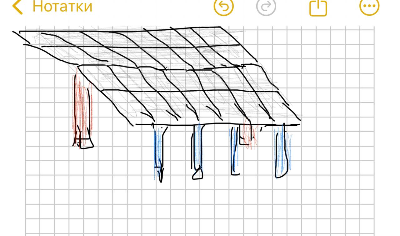Все почалося зі стандартного запиту: розмістити сонячну електростанцію на городі. Процес ескізного проектування на цьому етапі включав візуалізацію базової ідеї – класичної наземної конструкції. Ми створили первинний ескіз (подібний до того, що ви бачите на даному зображенні, де показані загальні габарити, кількість панелей та їх орієнтовне розміщення), щоб замовник — пан Віталій — міг чітко уявити майбутню станцію на своїй ділянці. Цей ескіз слугував відправною точкою для обговорення та уточнення деталей.