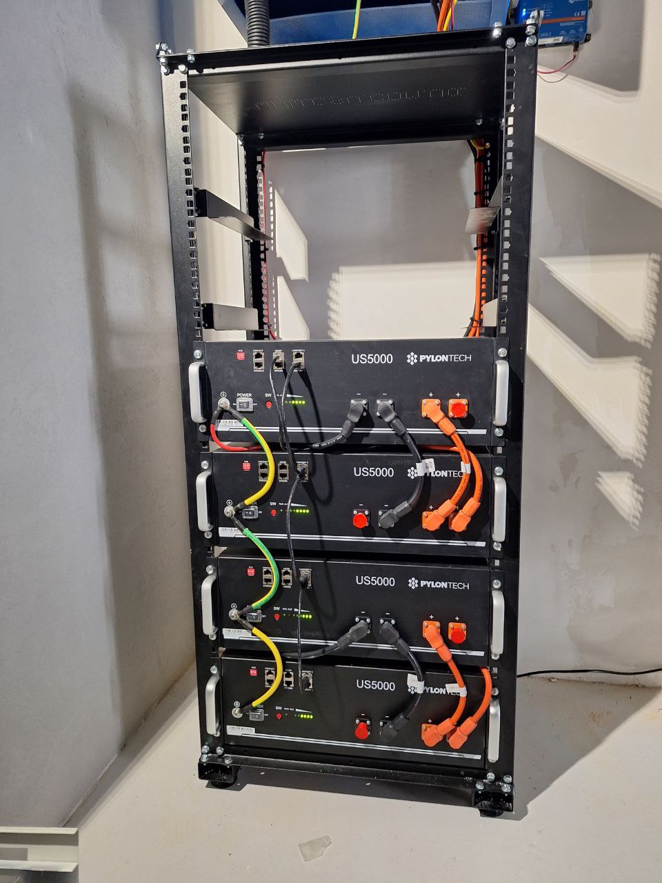 • Акумуляторні батареї Pylontech ємністю 20 кВт·год — накопичують енергію та забезпечують тривале живлення об’єкта навіть за відсутності основного постачання. АКБ встановлено у спеціальній стійці, що дозволяє у майбутньому легко збільшити ємність системи.