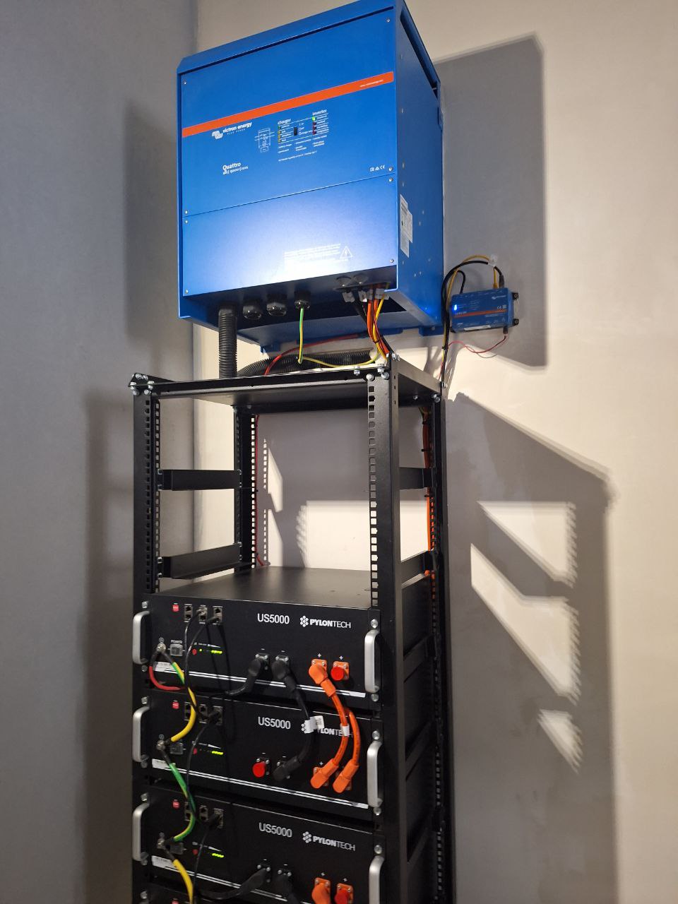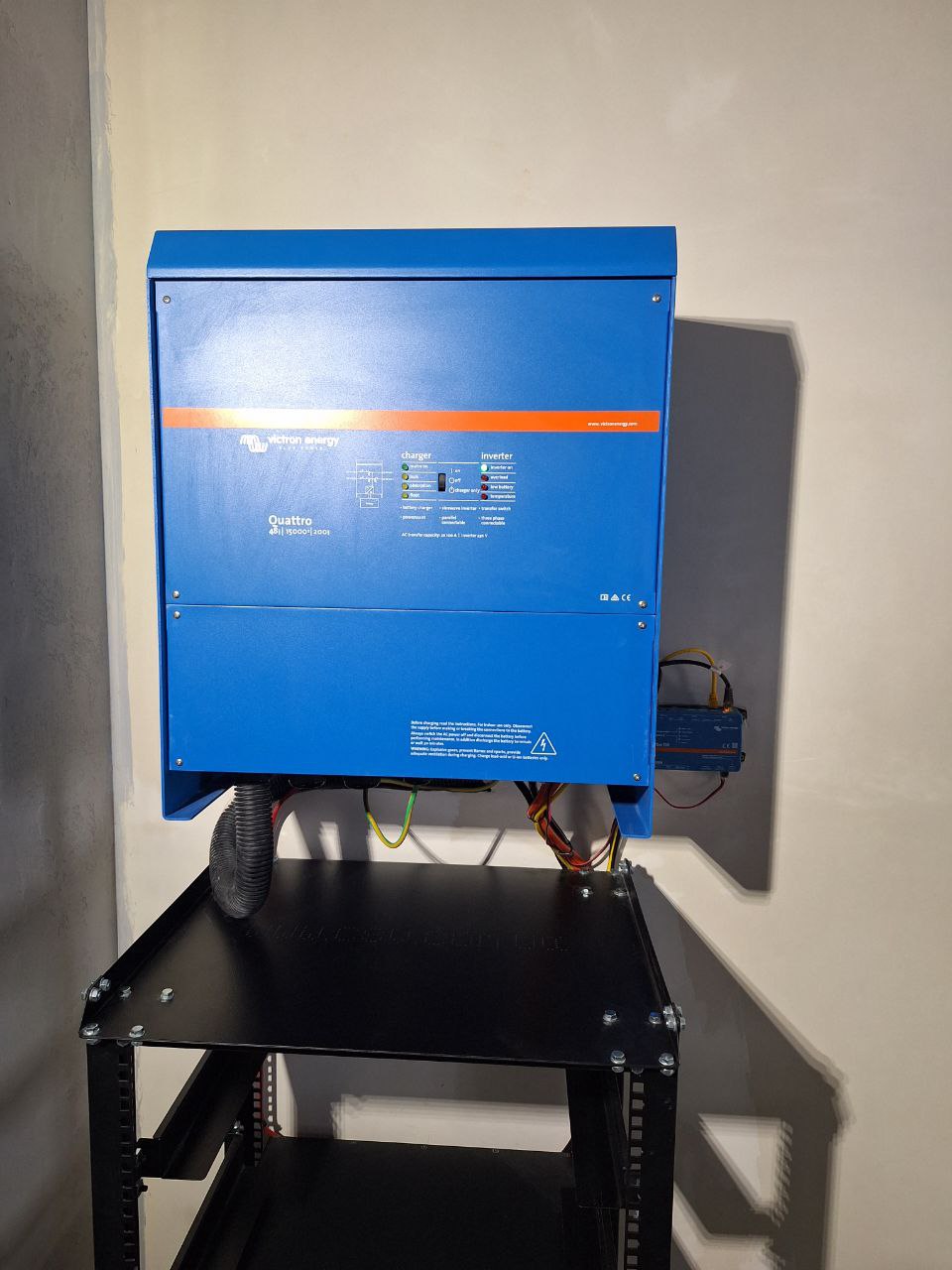 • Інвертор Victron Energy Quattro 15 кВт — забезпечує автоматичне перемикання на резервне живлення у разі відключення електроенергії, стабільно живить обладнання та підтримує якість електроенергії.