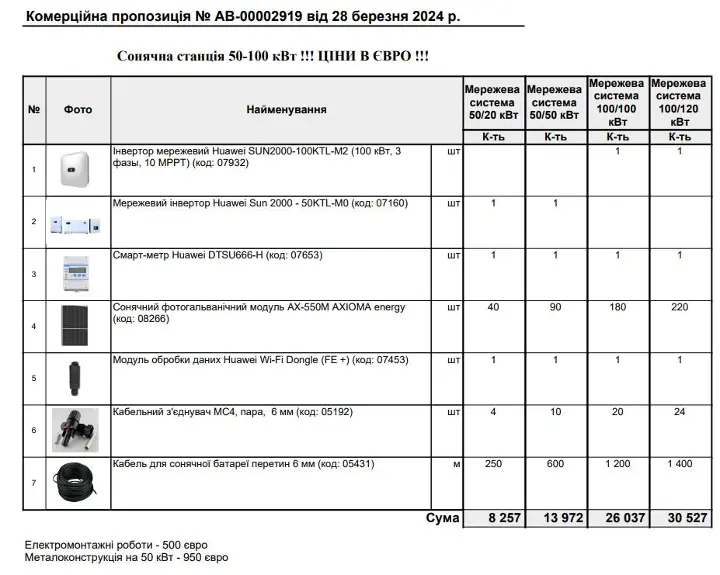 Скільки коштує сонячна станція потужністю 100 кВт та яка її окупність для комунального підприємства, у якого ціна за електроенергію 6 грн за кВт/год? 2024-03